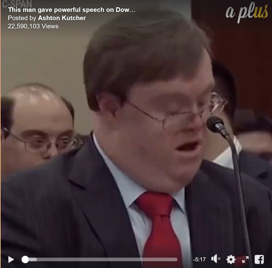 «Das Leben von jedem Menschen ist wertvoll», unter diesen Titel veröffentlichte der US-Schauspieler Ashton Kutcher Ende Januar ein Video auf Facebook, das sofort viral wurde. Zu sehen ist die Rede vom Sportler der Special Olympics und Schauspieler Frank Stephens vor dem US-amerikanischen Kongress 2017. Stephens hat Trisomie 21 und erklärt in dem über 5-minütigen Video, warum es ein grosser Fehler ist, ungeborene Babys mit Down-Syndrom abzutreiben.